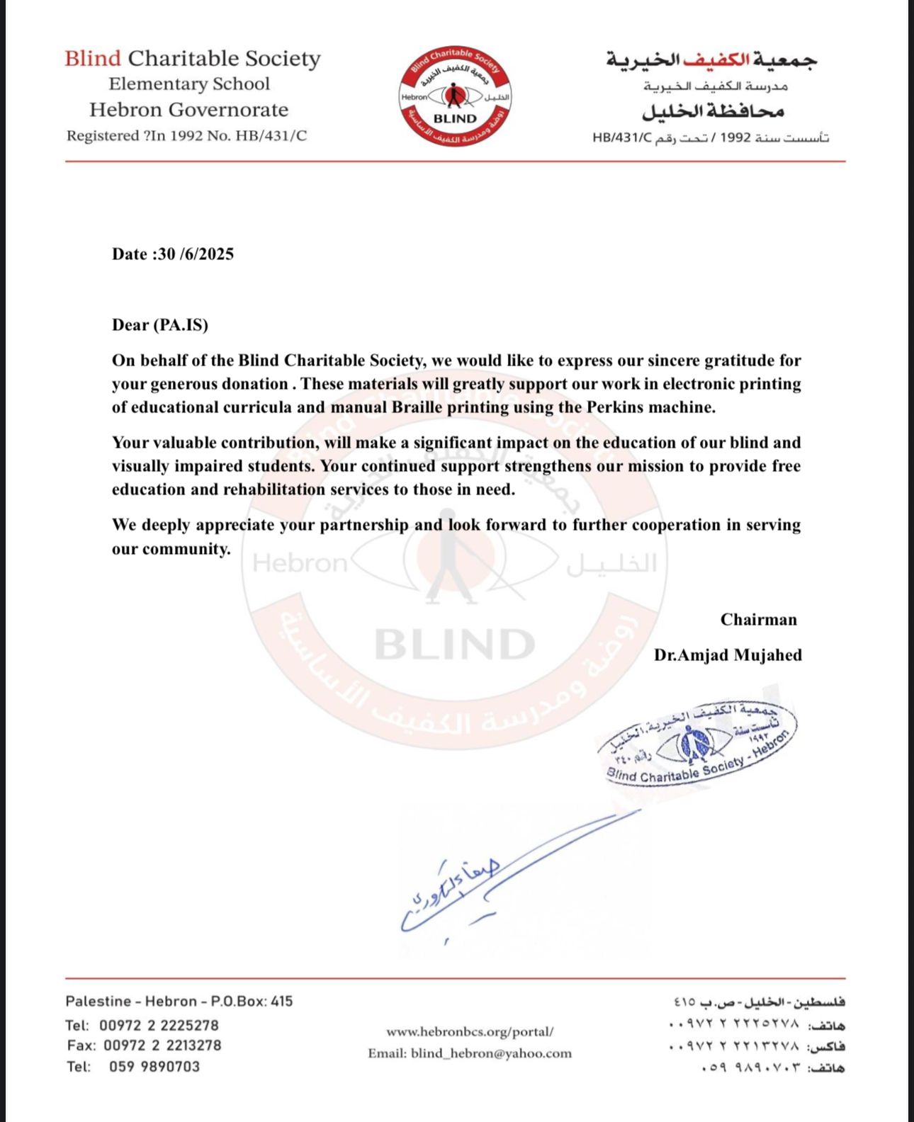 Au mois de Juillet et Août nous avons délivré du papier Braille, une imprimante et des cannes pour aveugles, à l’institution de Monsieur le Directeur Akram KAABNEH.